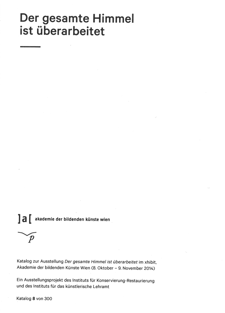 Katalog zur Ausstellung „Der gesamte Himmel ist überarbeitet“ im xhibit, Akademie der bildenden Künste Wien (8. Oktober – 9. November 2014). In der Praxis und Forschung der Restaurierung und Konservierung entstehen Objekte, die über ihre ursprüngliche Funktion als Testobjekt oder Hilfsmittel hinaus eine eigene Ästhetik entwickeln können.